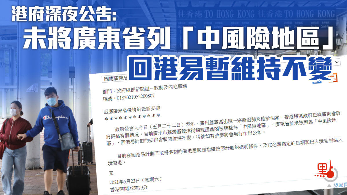 衞生署今日(22日)下午一度公布明天起將廣東省列入「中風險地區」,由廣東省回港須檢疫14天(鏈接)。政府發言人晚上發出公告,表示因應廣州荔灣區出現一宗新冠肺炎確診個案,香港特區政府正與廣東省政府評估有關情況,目前廣州市荔灣區龍津街錦龍匯鑫閣被調整為「中風險地區」,廣東省並未被列為「中風險地區」,回港易計劃的安排會暫時維持不變,稍後如有改變將會另行作出公布。