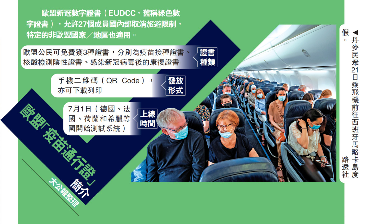 全球各國接種進度持續推進,能夠顯示疫苗接種情況和檢測結果的證書,成為人們出行的必備文件。夏季旅遊旺季即將到來,內部封鎖逾一年的歐盟宣布於7月1日起推行「疫苗通行證」,方便27個成員國公民在歐盟境內自由流動。