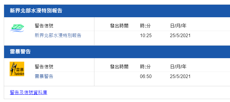 天文台在上午10時25分,發出新界北部水浸特別報告。天文台表示,受低壓槽影響,本港未來一、兩小時,部份地區雨勢可能較大,其中元朗區及新界北區雨勢特別大,並已錄得或預料會有每小時超過70毫米雨量,有可能出現嚴重水浸。