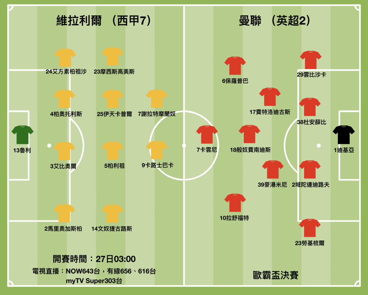 本屆歐霸盃決賽在波蘭城市格但斯克(Gdańsk)舉行。「紅魔鬼」曼聯當然希望重溫2016-17年度勇奪冠軍的美夢,但他們面對的對手已非缺乏經驗的阿積士,這次換上大賽經驗豐富的「黃色潛艇」維拉利爾。紅魔鬼主帥蘇斯克查能否奪得上任後首冠,非常考驗他今仗的臨場應變能力。(香港時間27日凌晨3時開賽,NOW643台,有線656、616台,myTV Super303台直播)