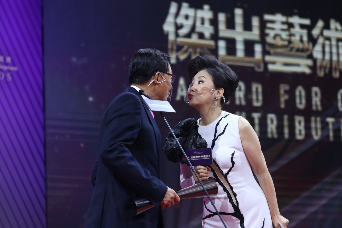 許冠文去年拍過抗疫片《總是有愛在隔離》,今日再亮相出席頒獎禮。許冠文從頒獎嘉賓汪明荃(阿姐)手中接過獎座時說,沒見阿姐兩年,很想來過一吻。他又問阿姐是否接種疫苗,阿姐說因她血壓高,暫時未能接種。許冠文聞言搞笑說:「那不好了?」不過最終二人還是隔着透明口罩作狀一吻。