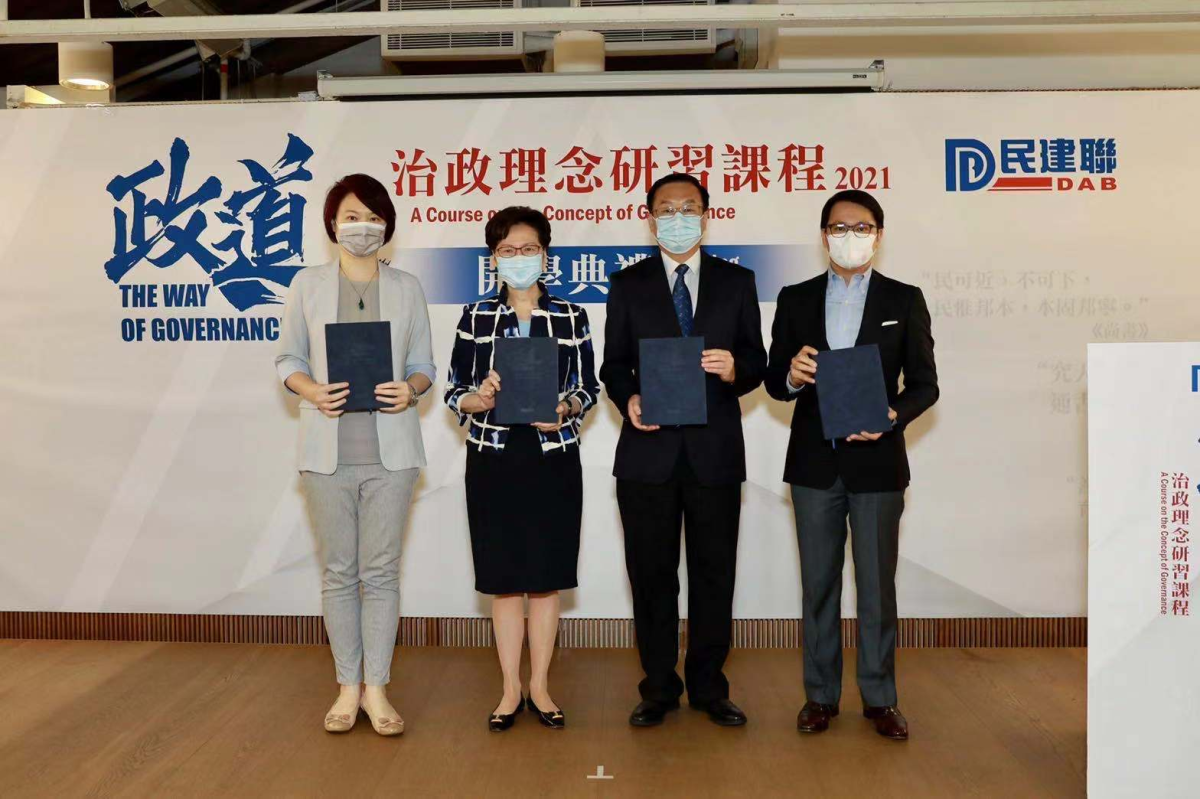 6月5日,民建聯舉辦「政道」治政理念研習班開班儀式。香港中聯辦副主任何靖應邀出席致辭,並與香港特區行政長官林鄭月娥共同主禮。