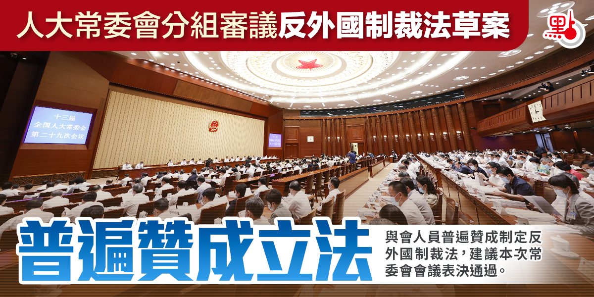 對於反外國制裁法草案,與會人員普遍認為,為了堅決維護國家主權、安全和發展利益,反對霸權主義和強權政治,制定一部專門的反外國制裁法十分必要,有利於充實和豐富反制裁、反干涉、反制長臂管轄的法律「工具箱」,為我國依法反制外國歧視性措施提供有力法治保障。與會人員普遍贊成制定本法,建議本次常委會會議表決通過。