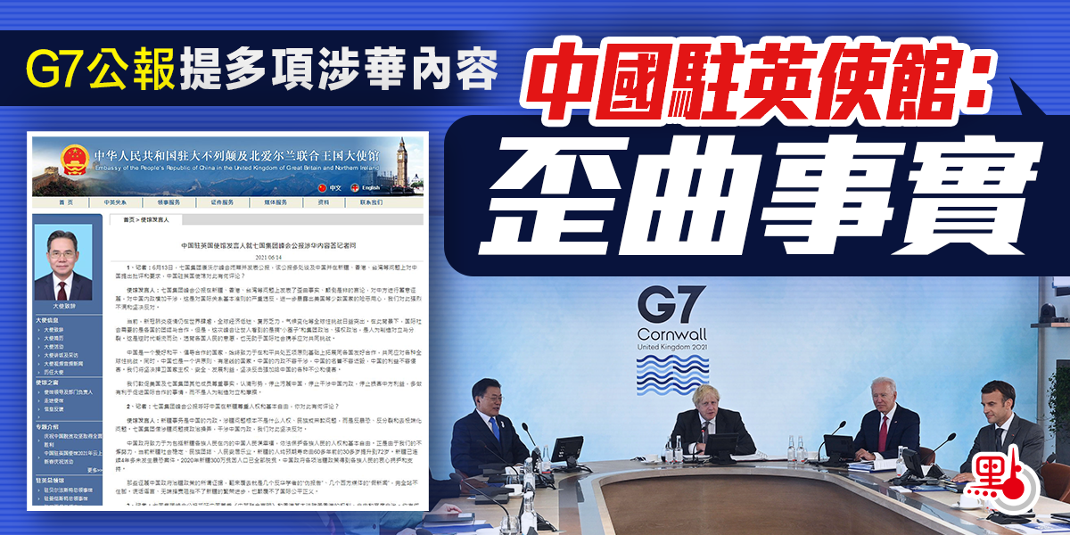 為期3天的七國集團(G7)峰會13日在英國落幕。中國駐英使館今日(14日)在網站發文,批評七國集團公報,在新疆、香港、台灣等問題上歪曲事實、顛倒是非,對中方進行蓄意誣衊,干涉中國內政,嚴重違反國際關係基本準則,進一步暴露出美國等少數國家的險惡用心,對此強烈不滿和堅決反對。