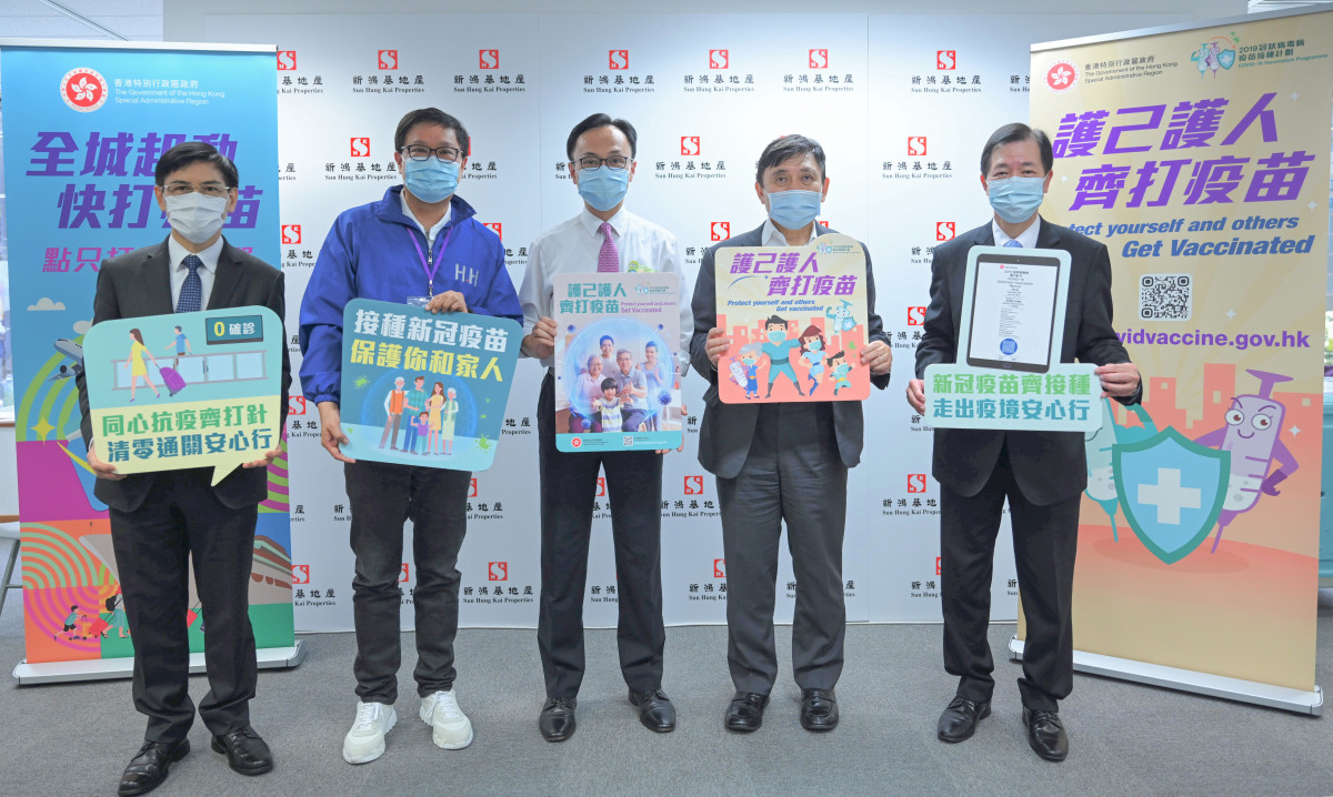 公務員事務局局長聶德權今日(15日)到訪位於灣仔的新鴻基地產總部,與新鴻基地產主席兼董事總經理郭炳聯一同視察該企業職員透過政府外展服務接種新冠疫苗情況。外展隊今日為該公司約200名職員接種復必泰疫苗。該公司職員享有僱主提供的「疫苗假期」,在接種疫苗當天及翌日可留在家中休息。