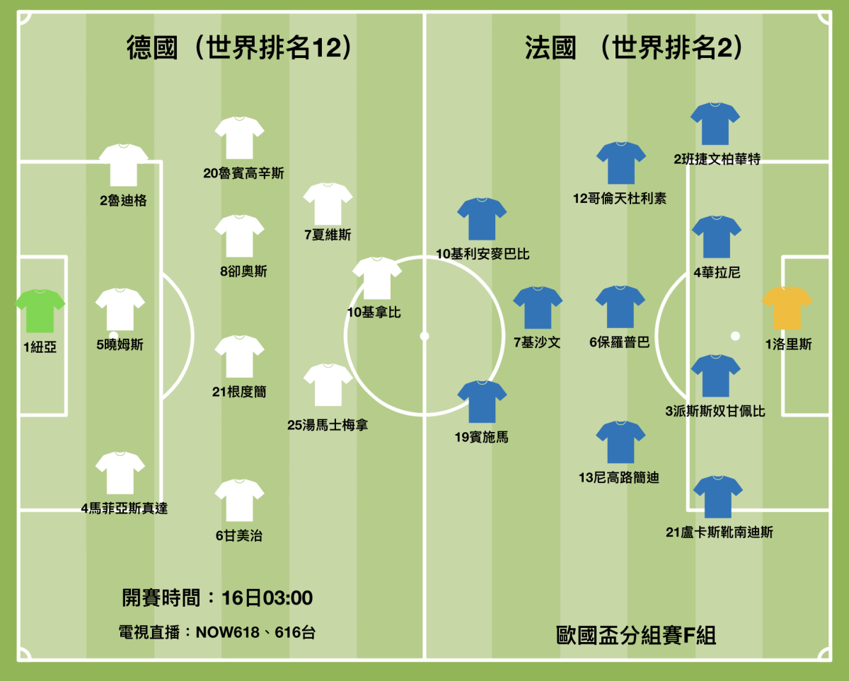 法國與德國兩支傳統勁旅在歐國盃「死亡F組」碰頭。鑑於今屆小組第三名仍有出線機會,兩隊大可放開懷抱互相搶攻。法國隊畢竟貴為世界盃冠軍,而且陣中球星相當勇銳,面對重組成效不彰要重召湯馬士梅拿救亡的德國隊,法國隊仍然是被看高一線。(香港時間16日凌晨3時開賽,NOW618、616台直播)