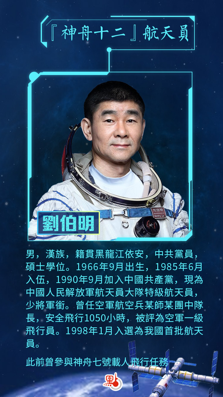 劉伯明,男,漢族,籍貫黑龍江依安,中共黨員,碩士學位。1966年9月出生,1985年6月入伍,1990年9月加入中國共產黨,現為中國人民解放軍航天員大隊特級航天員,少將軍銜。曾任空軍航空兵某師某團中隊長,安全飛行1050小時,被評為空軍一級飛行員。1998年1月入選為我國首批航天員。2005年6月,入選神舟六號飛行任務備份乘組。2008年9月,執行神舟七號飛行任務,同年11月,被中共中央、國務院、中央軍委授予「英雄航天員」榮譽稱號,並獲「航天功勛獎章」。2019年12月入選神舟十二號飛行任務乘組。