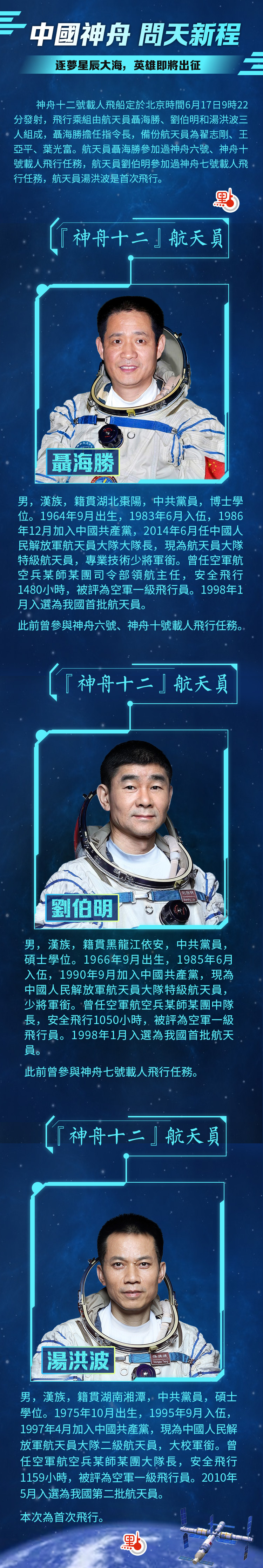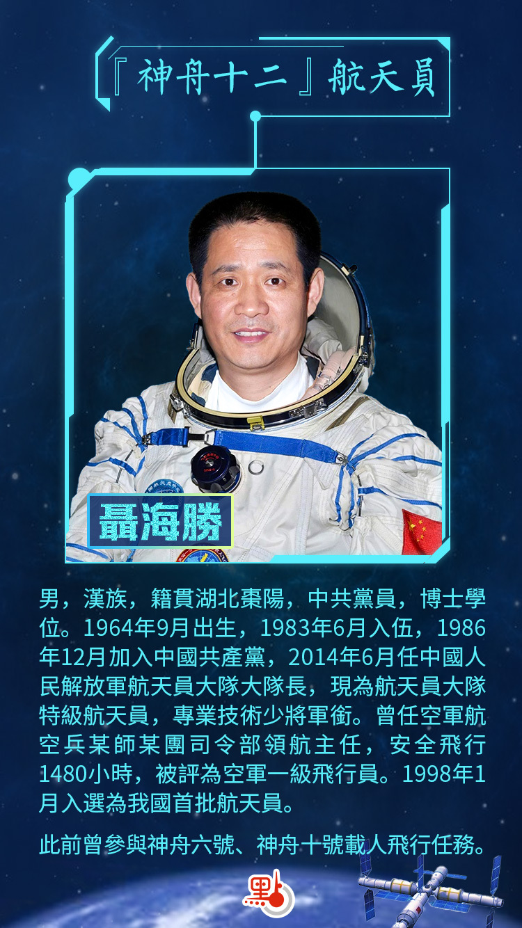 聶海勝,男,漢族,籍貫湖北棗陽,中共黨員,博士學位。1964年9月出生,1983年6月入伍,1986年12月加入中國共產黨,2014年6月任中國人民解放軍航天員大隊大隊長,現為航天員大隊特級航天員,專業技術少將軍銜。曾任空軍航空兵某師某團司令部領航主任,安全飛行1480小時,被評為空軍一級飛行員。1998年1月入選為我國首批航天員。2003年9月,入選神舟五號飛行任務備份航天員。2005年10月,執行神舟六號飛行任務,同年11月被中共中央、國務院、中央軍委授予「英雄航天員」榮譽稱號,並獲「航天功勛獎章」。2008年5月,入選神舟七號飛行任務備份航天員。2012年3月,入選神舟九號飛行任務備份航天員。2013年6月,執行神舟十號飛行任務,擔任指令長,同年7月,被中共中央、國務院、中央軍委授予「二級航天功勛獎章」。2019年12月入選神舟十二號飛行任務乘組,擔任指令長。
