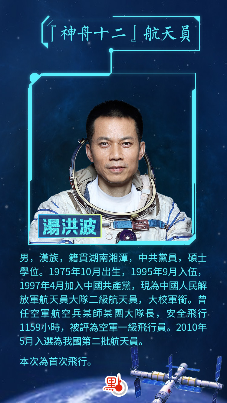 湯洪波,男,漢族,籍貫湖南湘潭,中共黨員,碩士學位。1975年10月出生,1995年9月入伍,1997年4月加入中國共產黨,現為中國人民解放軍航天員大隊二級航天員,大校軍銜。曾任空軍航空兵某師某團大隊長,安全飛行1159小時,被評為空軍一級飛行員。2010年5月入選為我國第二批航天員。2016年5月,入選神舟十一號飛行任務備份航天員。2019年12月,入選神舟十二號飛行任務乘組。