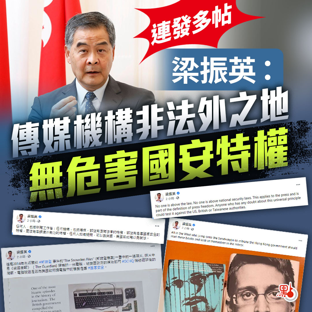 警方國安處今晨(17日)採取行動,拘捕《蘋果日報》5名董事及高層,指他們涉嫌串謀勾結境外勢力危害國家安全罪。警方並向法庭申請手令,進行搜查工作,包括壹傳媒大樓。全國政協副主席、香港特區前特首梁振英今日在社交平台Facebook上連發數條帖文,他強調,任何人,包括新聞工作者;任何機構,包括傳媒,都沒有凌駕法律的特權,都沒有危害國家安全的特權,更沒有串謀境外勢力的特權。他指出,任何人如有疑問,可以去英國、美國或台灣以身試法。
