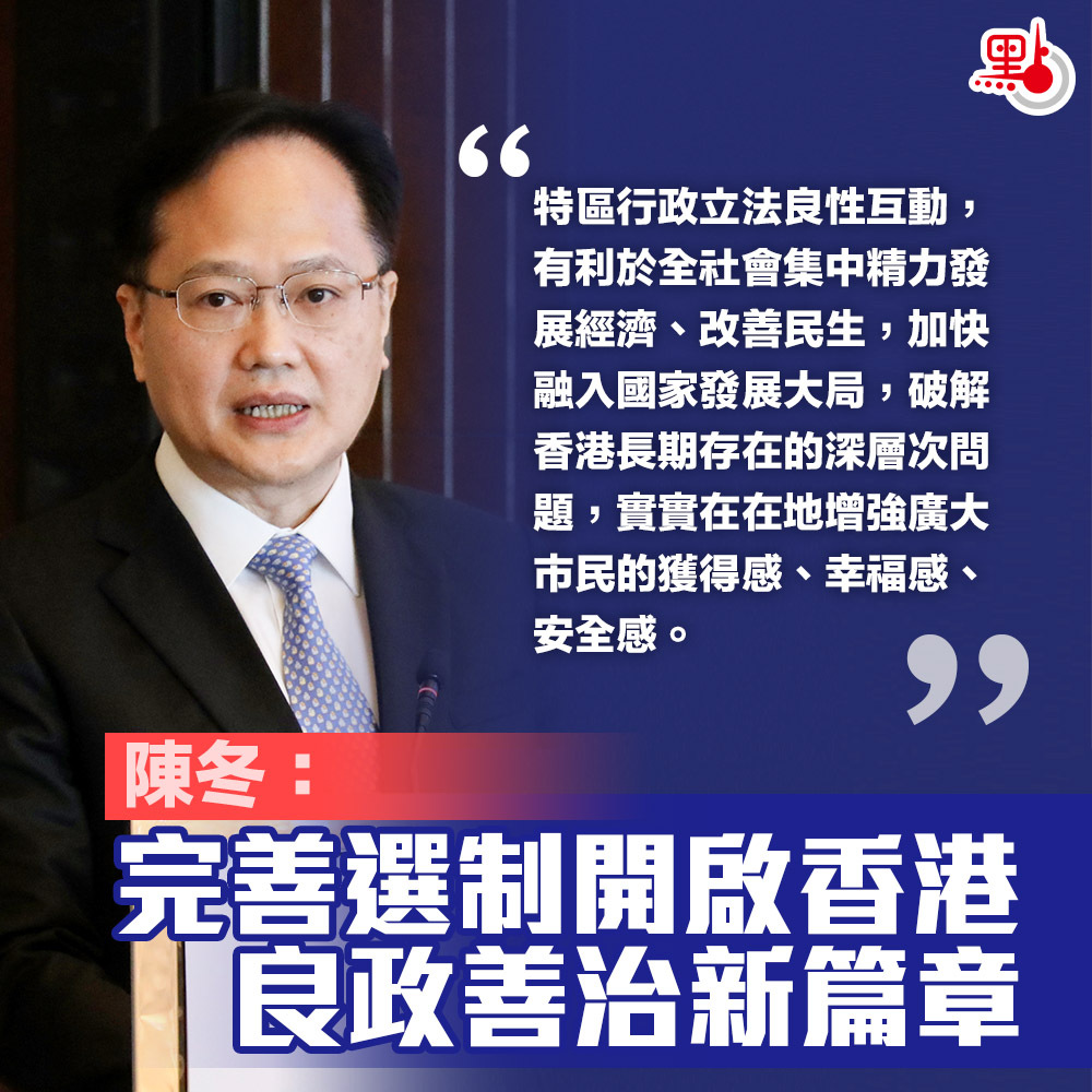中央人民政府駐香港聯絡辦公室副主任陳冬今日(18日)上午在全國港澳研究會2021年會學術研討會上致辭。陳冬強調,完善香港選舉制度,確保「愛國者治港」,開啟了香港良政善治的嶄新篇章。陳冬表示,「愛國者治港」不是什麼高標準,也不是要搞「清一色」,而是對從政者的基本要求。只要真心維護國家主權、安全、發展利益,尊重和維護國家根本制度和特區憲制秩序,全力維護香港繁榮穩定,依法進入特區管治架構的大門是敞開的,發揮作用的舞台是寬廣的。以下為陳冬副主任致辭全文: