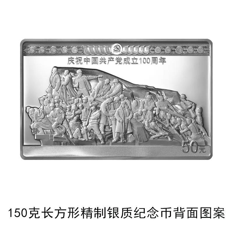 150克長方形銀質紀念幣背面圖案共有四種,分別為《信仰》、《偉業》、《攻堅》、《追夢》四幅雕塑局部造型,輔以中國共產黨歷史展覽館館徽等組合設計,並刊「慶祝中國共產黨成立100周年」字樣及面額。30克圓形銀質紀念幣背面圖案為中國共產黨成立100周年慶祝活動標識,輔以《長城頌》漆壁畫組合設計,並刊「慶祝中國共產黨成立100周年」字樣及面額。