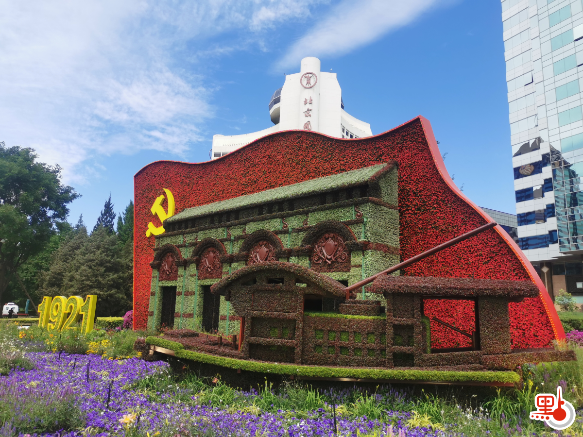 在北京建國門西北側,南湖紅船造型緩緩「啟航」,花壇左側擺放着鮮花築成的「1921」字樣,提示中國共產黨正是在百年前的1921年誕生。1921年8月,一大代表在嘉興南湖紅船審議通過了中國共產黨第一個綱領和第一個決議,選舉產生了中央局,宣告中國共產黨正式成立,中國革命的航船從南湖揚帆起航。