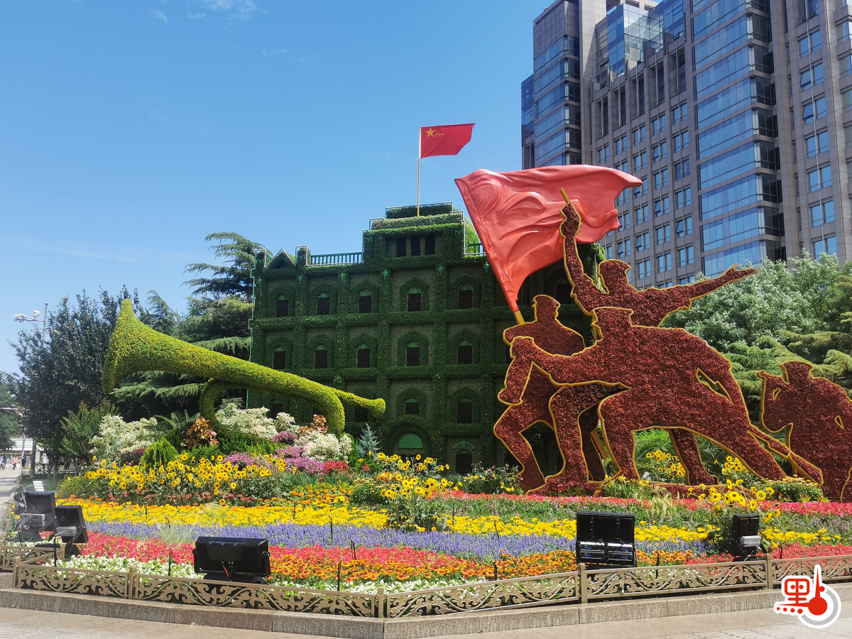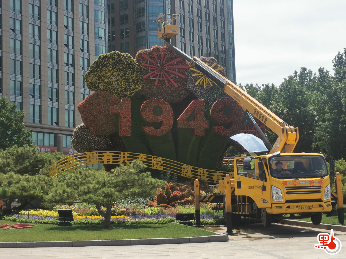 從1921年中國共產黨成立,中共團結帶領全國人民浴血奮戰28年,在1949年成立新中國。在北京東單路口,東北角一隅花壇描繪革命的號角吹響,先輩們錚錚鐵骨奮勇向前;東南角花壇裏,鮮花簇擁「1949」,下面音符狀的流線上寫着「沒有共產黨,就沒有新中國」的歌詞。