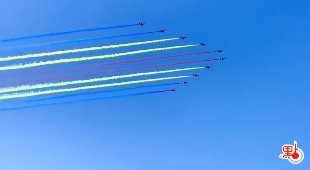 6月19日,北京天氣晴好,碧空如洗。上午9時左右,空中梯隊進行第二次綵排,可以看到,如6月13日首次綵排一樣,今次飛行再度擺出由10架飛機組成的「7.1」字樣和由29架飛機組成的「100」字樣造型,編隊整體十分壯觀。今次飛機沿長安街上空由東到西,然後進行了折返,其中還有10架飛機組成的編隊在途中首次拉起「彩虹」,藍、黃、紅交替的拉煙絢爛多彩。不少市民在長安街沿線路邊,在立交橋上,在居樓窗前拍照,社交朋友圈瞬間刷屏。