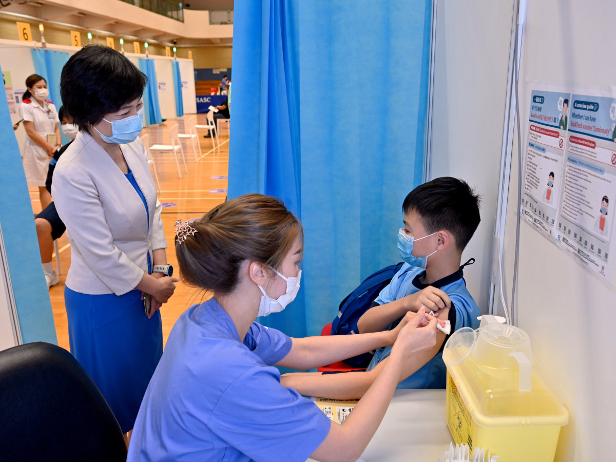 粉嶺官立小學20多名學生、教職員和學生家長今日(21日)下午透過團體預約形式到龍琛路體育館社區疫苗接種中心,接種新冠疫苗。教育局副局長蔡若蓮博士亦到場視察疫苗接種情況。有學生表示打針後感到開心,而學校老師亦曾宣傳打針的好處,認為打針可以保護自己及家人,會呼籲其他同學接種。