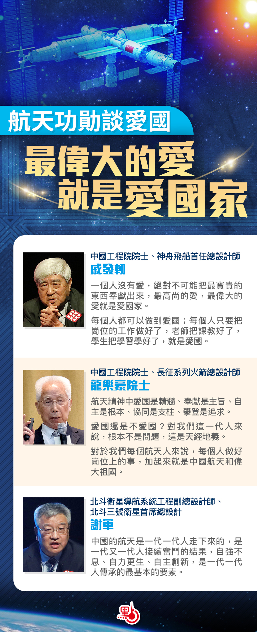 航天科學家團隊進校園暨當代傑出華人科學家公開講座活動「中國航天與航天精神」今天(24日)繼續舉行。連日來,中國工程院院士、神舟飛船首任總設計師戚發軔,中國工程院院士、長征系列火箭總設計師龍樂豪,北斗衛星導航系統工程副總設計師、北斗三號衛星首席總設計師謝軍等航天功勛科學家在多場講座中,以他們自身的成長經歷,用潤物細無聲的樸實語言,闡釋了航天精神就是愛國精神,中國一代又一代的航天人用他們對航天事業的追求,對偉大祖國的熱愛與無私奉獻,向港人尤其是香港年輕人表明,最高尚的愛,最偉大的愛就是愛國家。