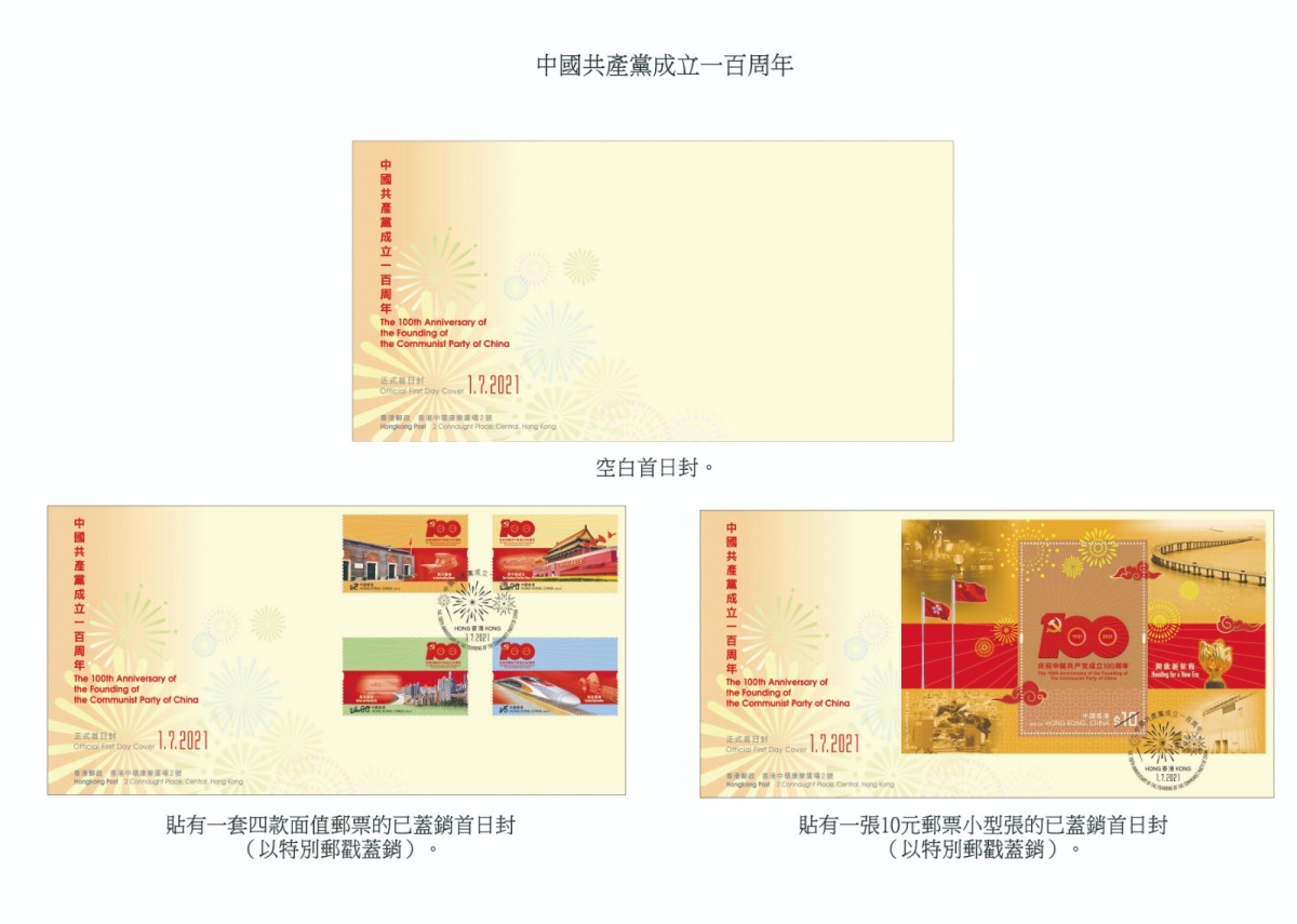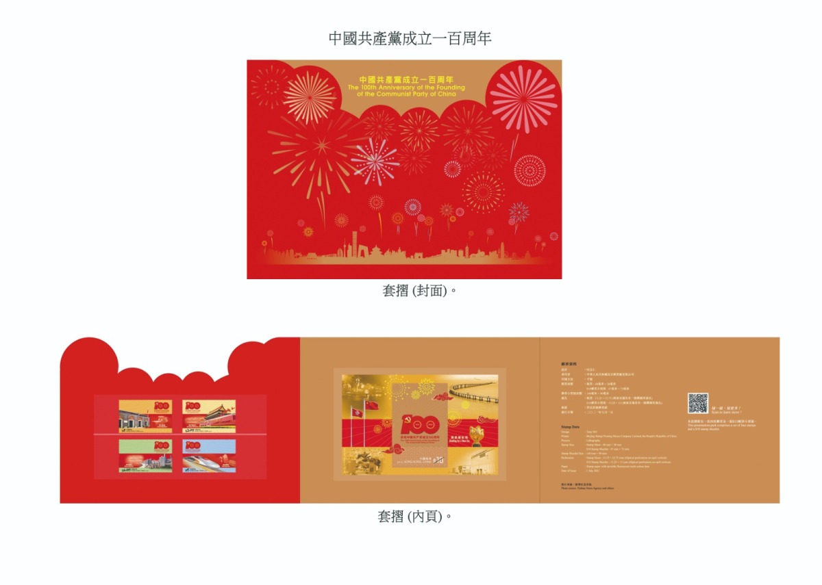 香港郵政早前宣布將於7月1日發行以「中國共產黨成立一百周年」為題的紀念郵票及相關郵品,今日(28日)除公布郵票、郵票小型張及首日封樣式及定價外,亦公布套摺的樣式。