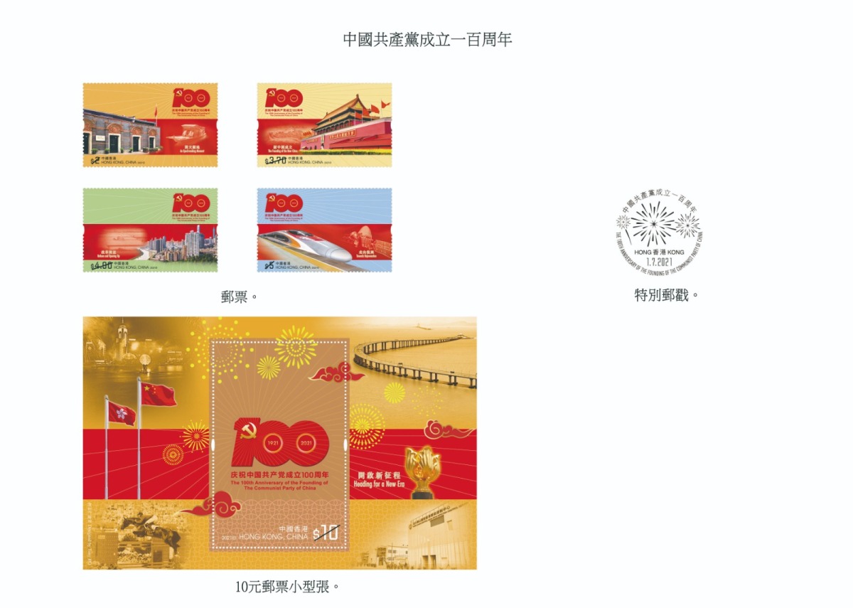 一套四枚郵票及一張郵票小型張分別定價15.6元及10元,引用了中國共產黨成立100周年慶祝活動的唯一官方指定標識,包括圖案及主題名稱引用於郵票設計內,而標識內之56根光芒線寓意中國共產黨奮進之光照耀中華大地。郵票將光芒線延伸,在鮮紅的黨旗飄揚下,串連每一枚郵票,分別展示黨領導新中國的成立和發展,實現為人民謀幸福、為民族謀復興、為世界謀大同的目標。以特別郵戳蓋銷首日封的一套四枚郵票及一張郵票小型張分別定價20.1元及14.5元。