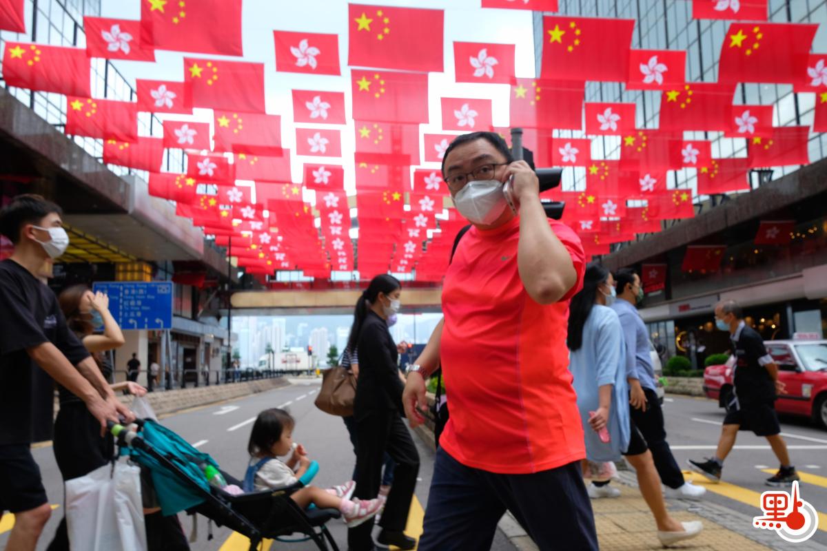 尖沙咀東麼地道-尖沙咀中心紅旗一片,市民紛紛和國旗與區旗合影留念。(點新聞記者麥鈞傑攝)