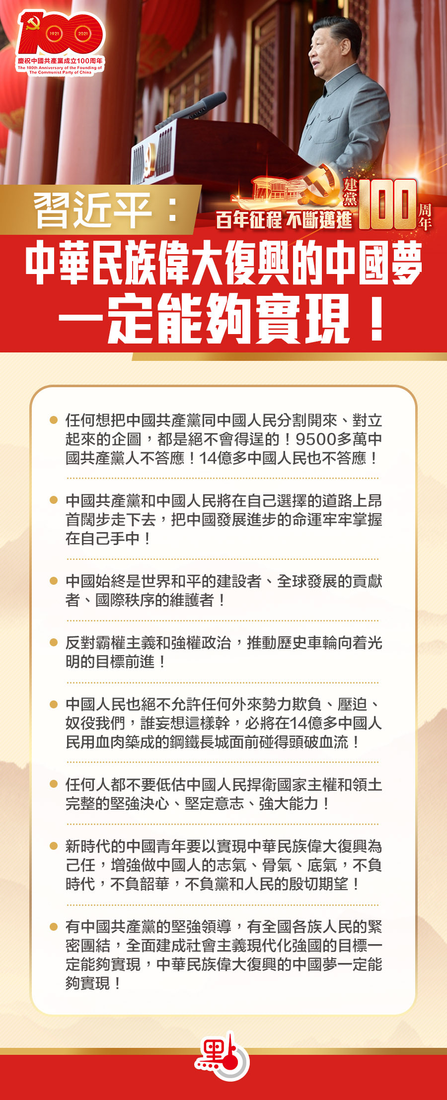 慶祝中國共產黨成立100周年大會今日(1日)上午8時在北京天安門廣場隆重舉行。中共中央總書記、國家主席、中央軍委主席習近平發表重要講話。習近平強調,中國共產黨和中國人民將在自己選擇的道路上昂首闊步走下去,把中國發展進步的命運牢牢掌握在自己手中。習近平期望,新時代的中國青年要以實現中華民族偉大復興為己任,增強做中國人的志氣、骨氣、底氣,不負時代,不負韶華,不負黨和人民的殷切期望。