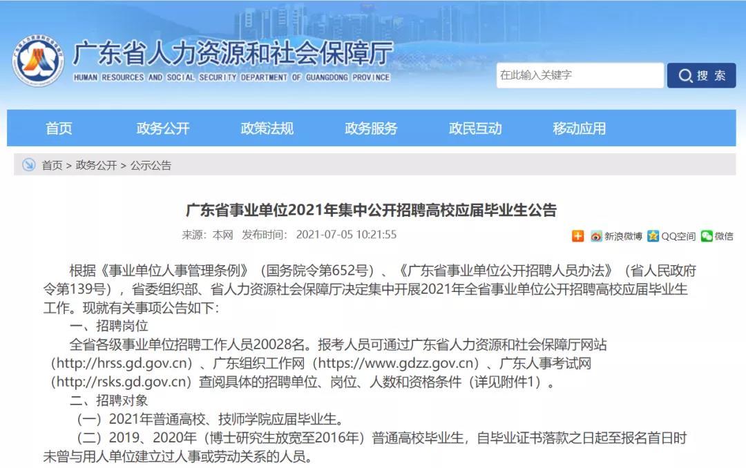 廣東省委組織部、廣東省人社廳今日(5日)聯合發布《廣東省事業單位2021年集中公開招聘高校應屆畢業生公告》。其中廣州、深圳、珠海、佛山、惠州、東莞、中山、江門、肇慶及廣東省直機關駐上述各地事業單位的9000餘個崗位,符合《粵港澳大灣區(內地)事業單位公開招聘港澳居民管理辦法(試行)》及公告規定的港澳應屆畢業生可報考。