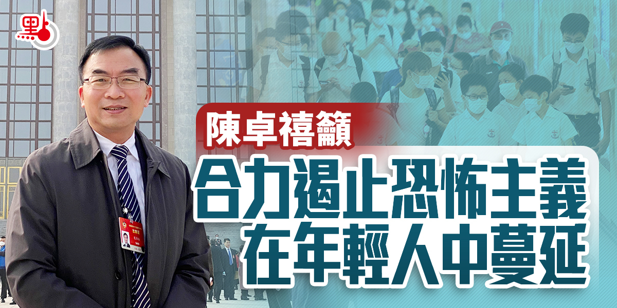 「港獨」組織「光城者」有9人涉嫌策劃爆炸案被拘捕,其中6人為中學生。全國政協委員、港專學院校長陳卓禧今日(8日)呼籲,成年人要珍愛青少年,合力遏止恐怖主義在年輕人中蔓延。他強烈譴責再有成年人教唆及誘使青少年參與策劃及進行暴力襲擊,危害社會安全,毀掉青少年的前途。