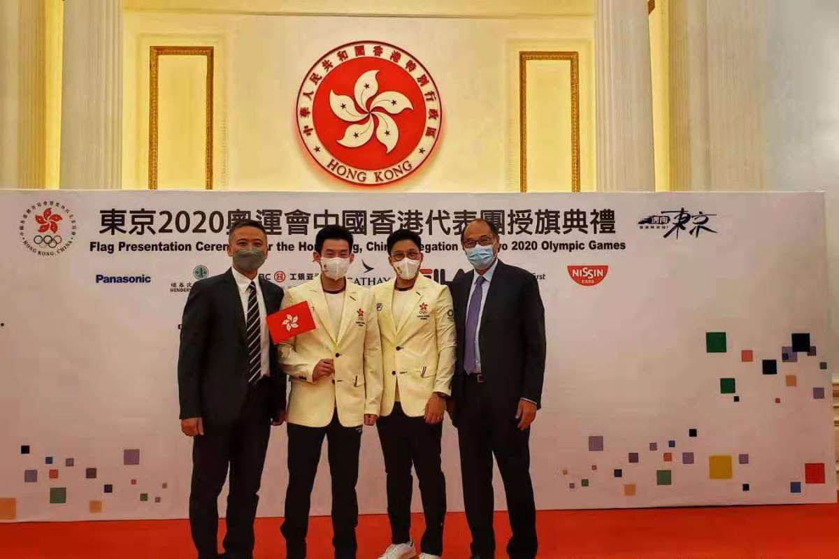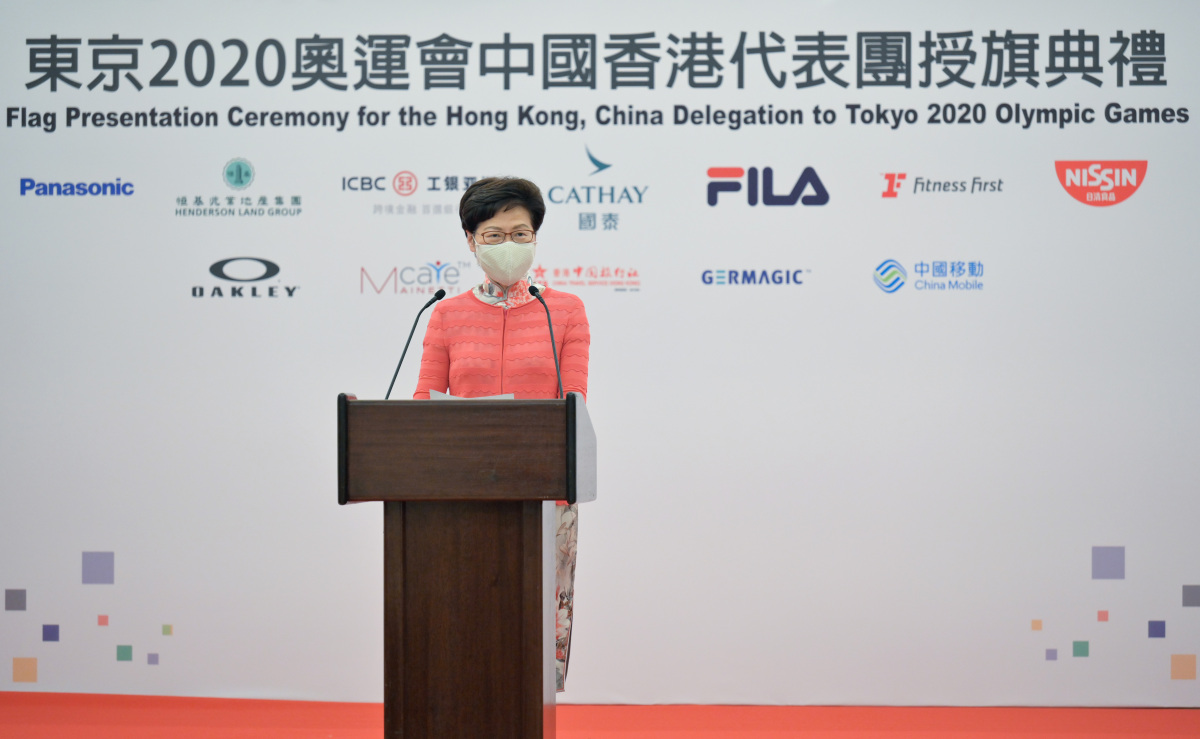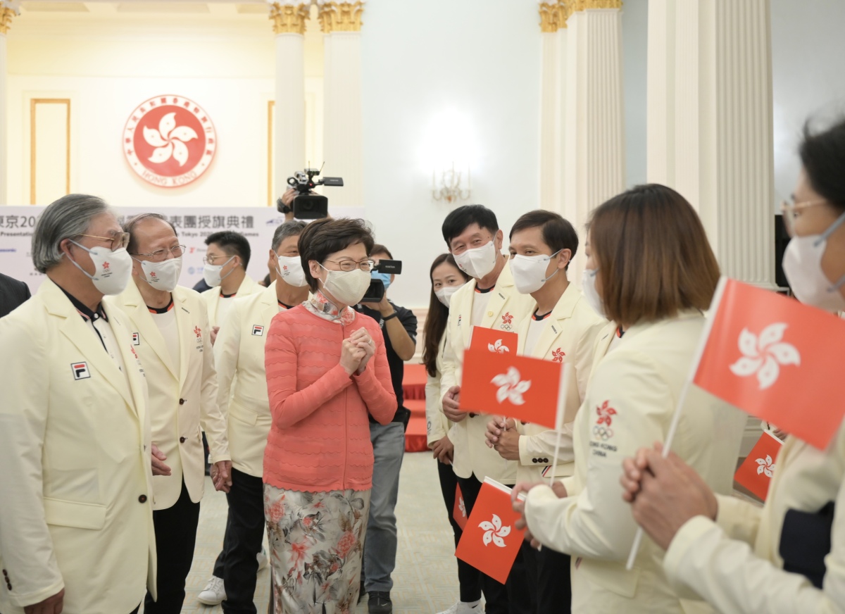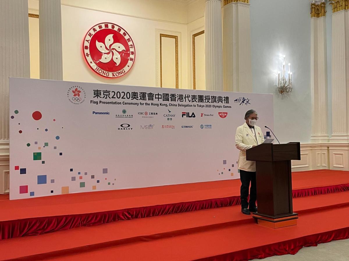 港協暨奧委會在行政長官林鄭月娥、香港中聯辦副主任盧新寧、民政事務局局長徐英偉以及一眾嘉賓的見証下,將香港特區區旗授予港協暨奧委會會長霍震霆及東京奧運中國香港代表團團長貝鈞奇。