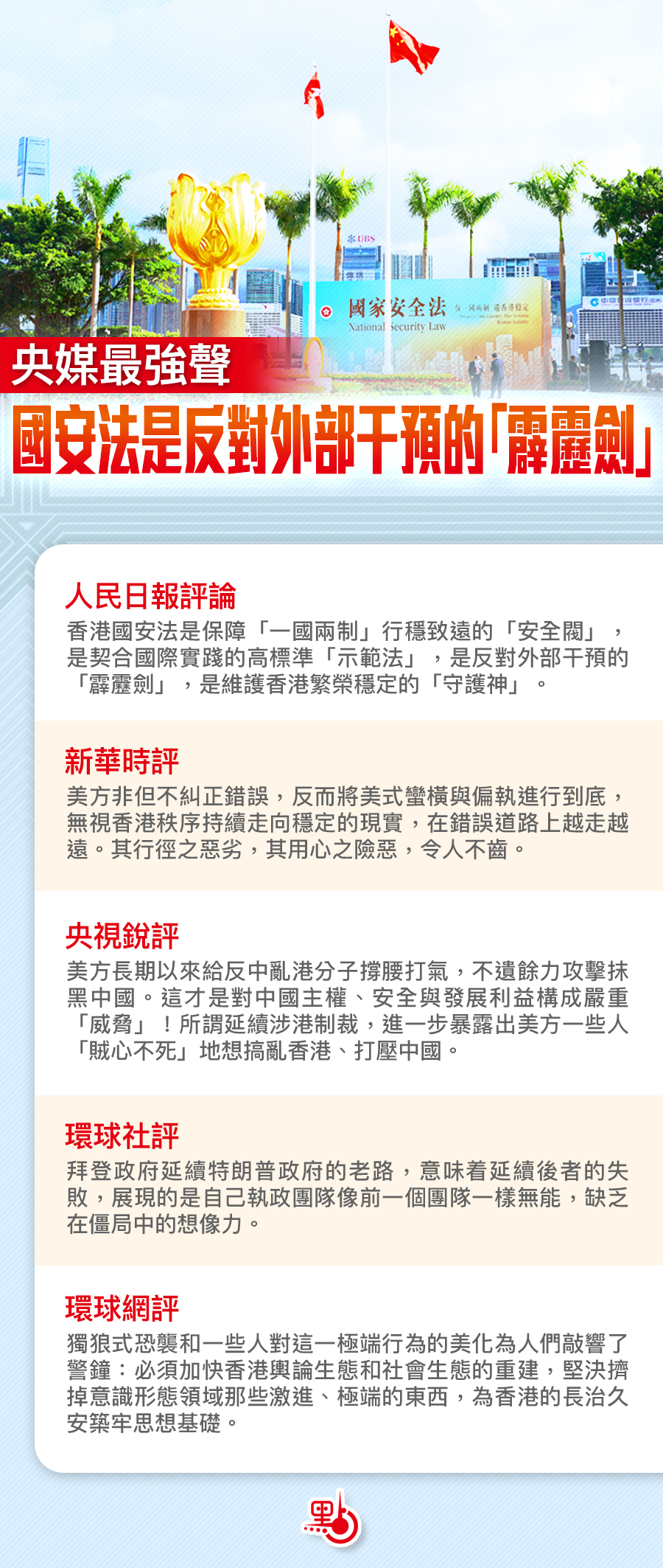 香港國安法實施一年來,香港社會回復和諧和平,市民安居樂業,整個社會總體上風清氣正。就在社會各界齊心合力共謀發展繁榮之際,在銅鑼灣街頭發生「孤狼式」暴徒恐怖襲擊執法警員並自殺身亡的血腥慘案。美國當局及歐洲反華政客無視香港社會穩定的客觀事實,一意孤行地推動其反華遏華圖謀,藉詞無理制裁中央及香港官員。《人民日報》《新華社》《環球時報》等內地媒體昨日先後發表評論文章,明確指出,香港國安法是保障「一國兩制」行穩致遠的「安全閥」,是契合國際實踐的高標準「示範法」,是反對外部干預的「霹靂劍」,是維護香港繁榮穩定的「守護神」。所有對香港和中國內地的無理制裁都將遭到反擊,美歐將蒙受與中國因為衝突而產生的同樣損失。奉勸歐美反華政客自我克制,不要搬起石頭砸了自己的腳。