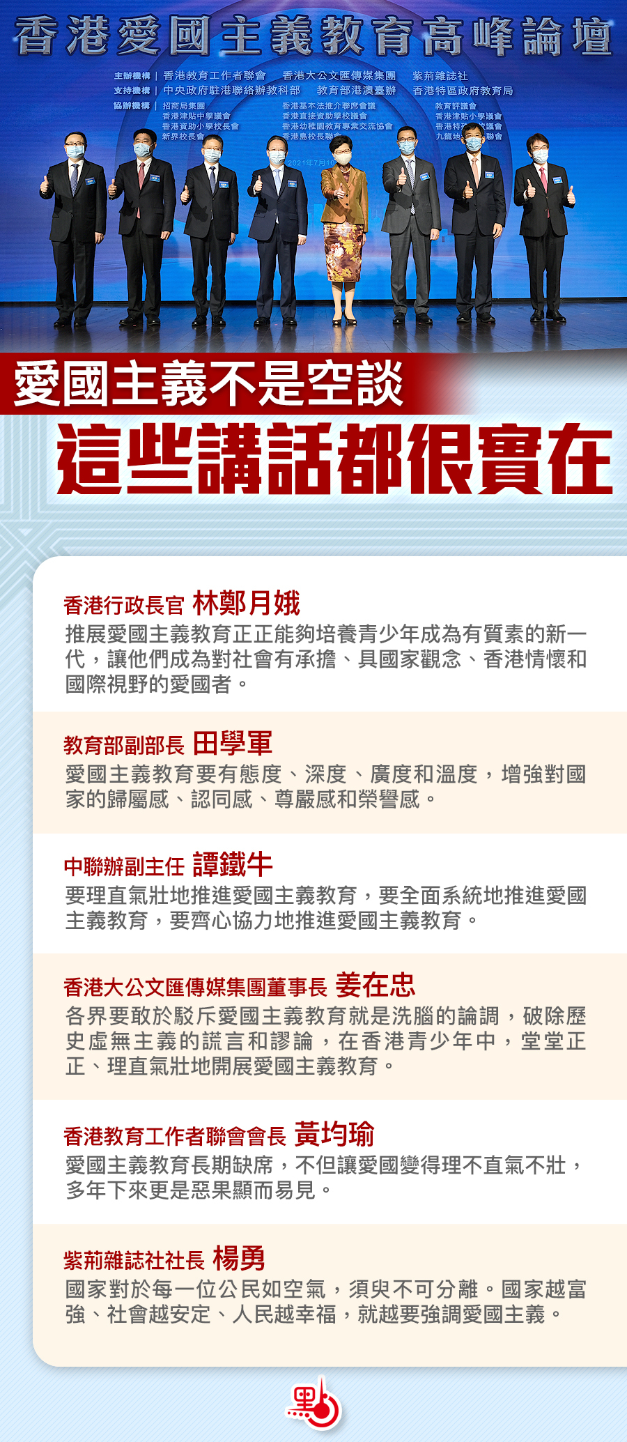 香港特別行政區行政長官林鄭月娥、教育部副部長田學軍、中央政府駐港聯絡辦副主任譚鐵牛、香港大公文匯傳媒集團董事長姜在忠、紫荊雜誌社社長楊勇、香港教育工作者聯會會長黃均瑜等嘉賓出席並致辭。各嘉賓在致辭時一致強調,在香港理直氣壯地加強愛國主義教育,刻不容緩。社會各界必須理直氣壯地推進愛國主義教育,全面系統地推進愛國主義教育,齊心協力地推進愛國主義教育。
