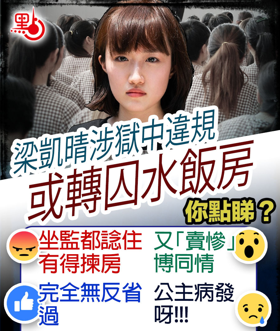 攬炒派前觀塘區議員梁凱晴因明知而參與未經批准集結罪,早前被判入獄四個月。她的社交平台專頁日前發布梁的獄中信,聲稱入獄第一日就被恐嚇,曾向署方申請轉調單人倉,卻遲遲未批,最後以「理據不充份」拒絕其申請。專頁小編指,懲教正調查凱晴是否有違規行為,有機會會以單獨囚禁(水飯房)作懲處;又「賣慘」博同情話最近到獄中探望梁凱晴,見佢再瘦咗,因工作環境較苛刻,出暗瘡、 出汗疹、難以入眠喎。