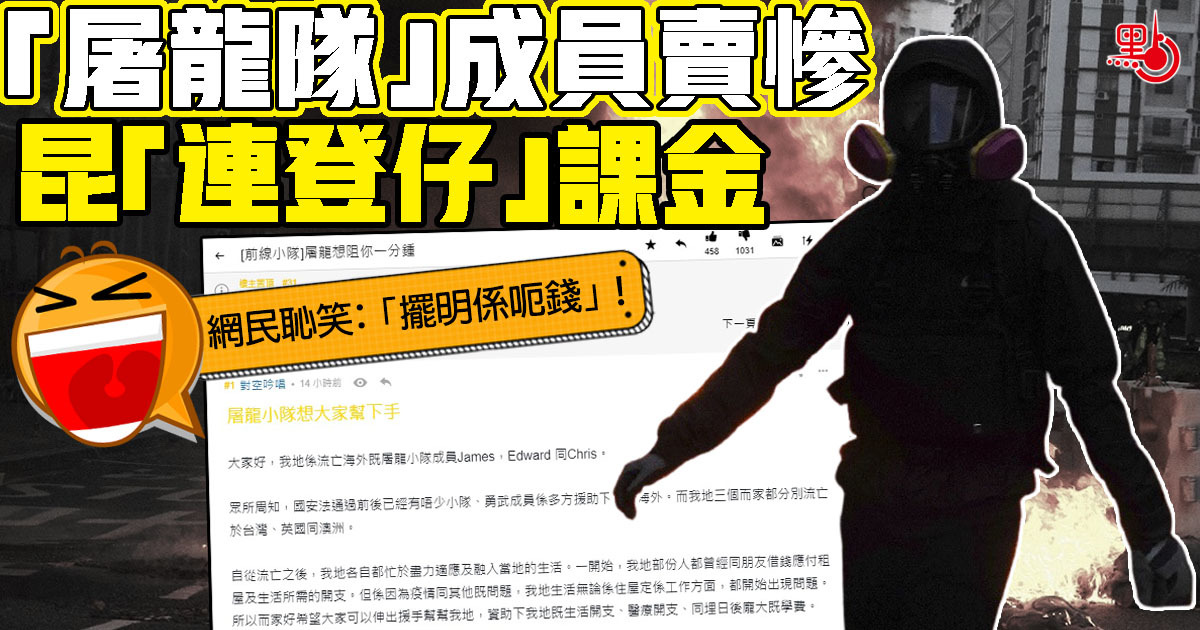 「對空吟唱」噚日以「屠龍想阻你一分鍾(鐘)」為題發帖,稱佢哋係「流亡海外既(嘅)屠龍小隊成員James,Edward同Chris……分別流亡於台灣、英國同澳洲。」然後,賣慘話「流亡」之後各自都忙於盡力適應及融入當地嘅生活,不過因為疫情同「其他問題」,令佢哋喺住屋同工作方面都開始出現問題喎,所以希望大家資助吓佢哋生活開支、醫療開支、同埋日後龐大既學費咁話。睇埋佢哋眾籌嘅網頁,內容話去咗去澳洲的「Edward」患有先天眼疾要做手術,又話佢喺黑暴中俾橡膠子彈「擊中後腦」,網頁入面仲有疑似爆後腦嘅相㖭。