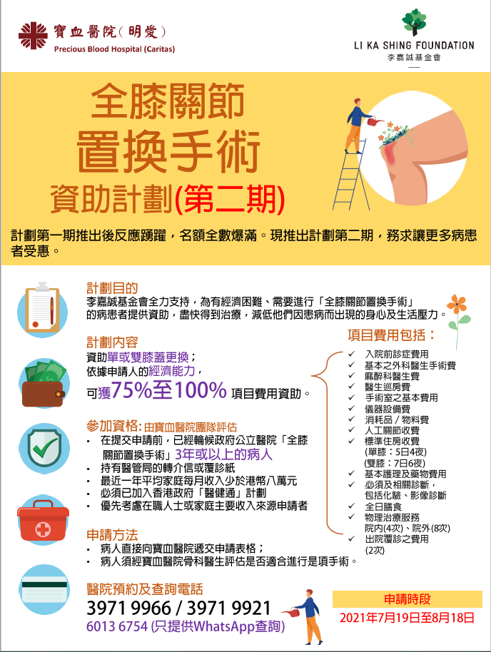 請直接向寶血醫院(明愛)遞交表格,經該院骨科醫生評估後,再按經濟狀況,決定申請人可獲七成半至全額資助。查詢請致電39719966、39719921或 WhatsApp 60136754。