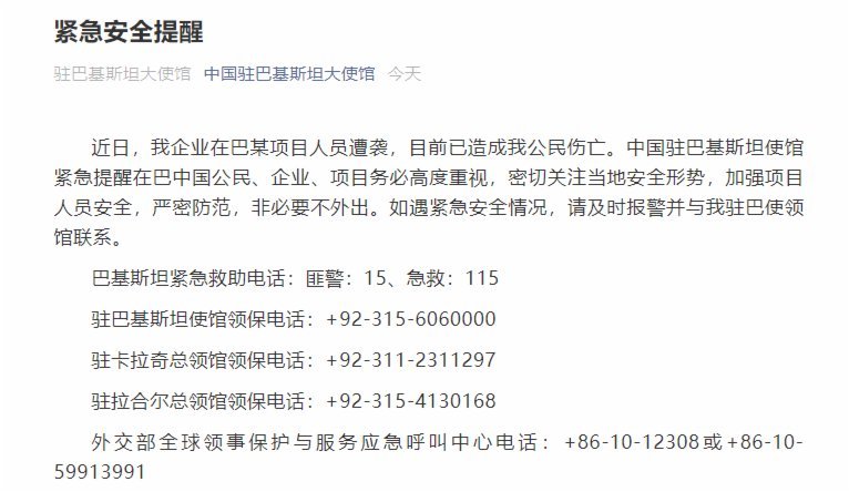 中國駐巴基斯坦大使館微信公號今日發布緊急安全提醒,近日有中國企業在巴某項目人員遭襲,目前已造成我公民傷亡。使館緊急提醒在巴中國公民、企業、項目務必高度重視,密切關注當地安全形勢,加強項目人員安全,嚴密防範,非必要不外出。