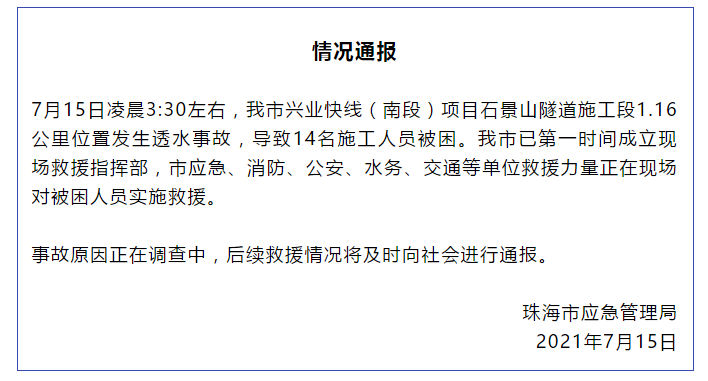 今日(15日)凌晨3時半,珠海市興業快線南段項目石景山隧道施工段1.16公里位置發生透水事故,導致14名施工人員被困。珠海市已第一時間成立現場救援指揮部,市應急、消防、公安、水務、交通等單位救援力量正在現場對被困人員實施救援。