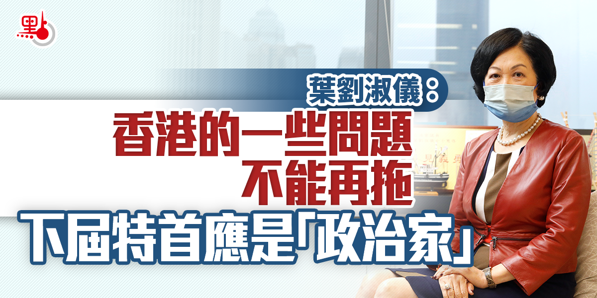 葉劉淑儀指出,無論是政治、經濟還是社會層面,「這些問題都不能再拖下去了」。她認為,下一屆港府應該是一個具有開創型風格的團隊,而非守成型班子。下一任行政長官需要做到「一手硬,一手軟」,在打擊「反中亂港」分子時毫不手軟,但面對一些叛逆的年輕人時不能都採取「抓」的辦法,要逐步「移風易俗」,改變香港社會氛圍,而非簡單地遵循過去的傳統。她說,這一任務難度很高,需各方努力,也需下一任行政長官是「一名政治家,而不僅僅是公務員」。