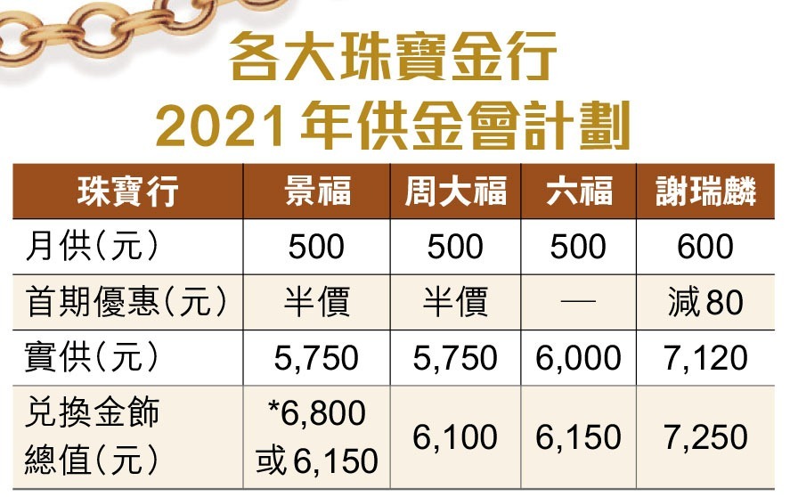 所謂供金會,是以月供黃金的形式供款,在一年後,以優惠價兌換金飾,加上不少珠寶金行都會提供首期供款減半優惠及贈品,確實有着數。至於供金會的金額可謂豐儉由人,由100元、300元、500元以至1000元或以上都有,供滿一年後可以取得比供額價值高少少的金飾。