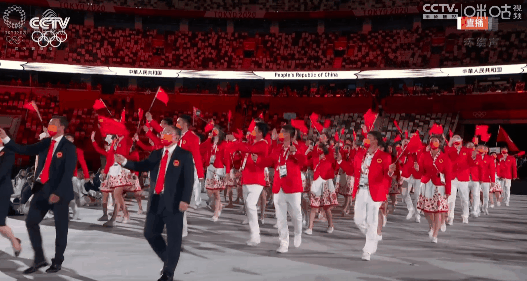 中國體育代表團步入東京奧林匹克體育場,女排運動員朱婷、跆拳道運動員趙帥執旗,選手們全部身穿紅色外套。在本屆奧運會上,中國體育代表團由777人組成,是中國體育代表團境外參賽規模最大的一屆奧運會。其中運動員431人,包括女運動員298名、男運動員133名。