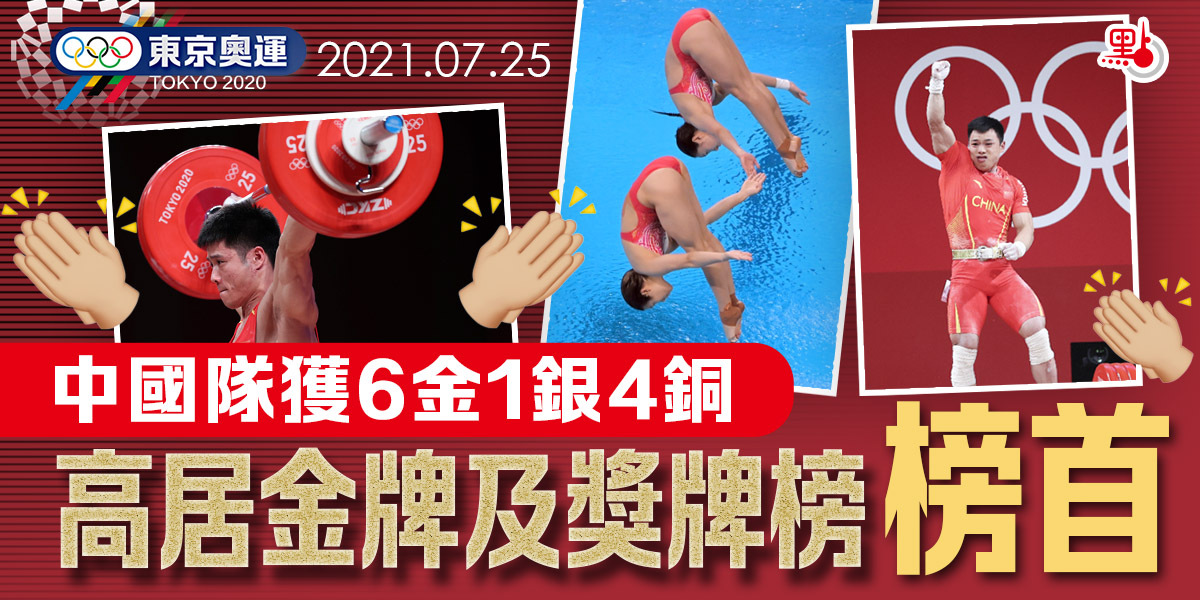 繼中國代表團在東京奧運會首日(24日)賽事以3金1銅高踞獎牌榜首位後,今日(25日)再創佳績。中國代表團今日摘得3金1銀3銅,累計獲得6金1銀4銅,位列金牌榜及獎牌榜首位。日本隊獲得5枚金牌暫位列金牌榜第二;美國隊獲得4金2銀2銅,獎牌榜位列第二。