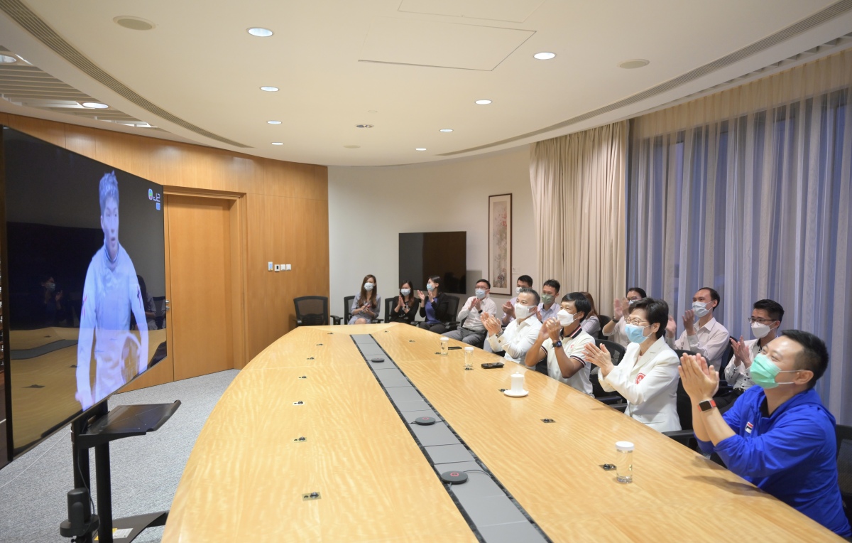 林鄭月娥說:「我和很多市民一樣,透過電視直播緊貼家朗今天的比賽,為他打氣。家朗技術出眾,而且在比賽中冷靜沉着,在逆境時展現出過人鬥志,最終成功為香港創造歷史,令人振奮。他的佳績證明了香港運動員的實力,讓全港市民引以為傲。」她並祝願中國香港代表團在其他項目繼續盡展所長,取得佳績。