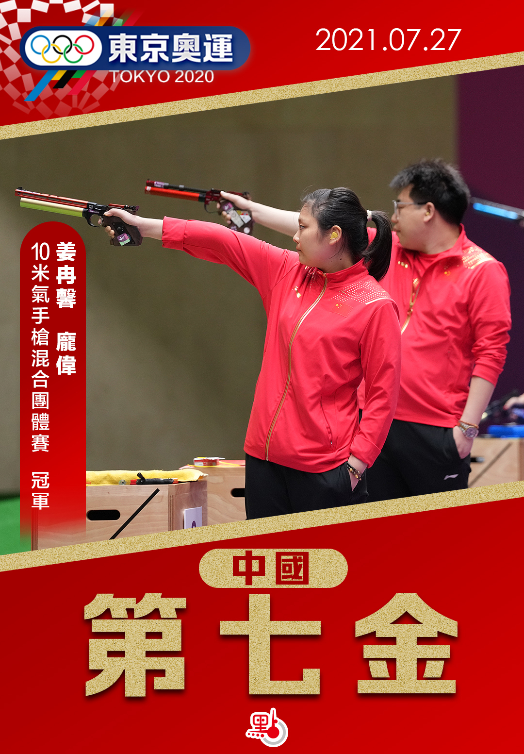 東京奧運今日(27日)舉行的10米氣手槍混合團體金牌戰中,國家隊姜冉馨及龐偉在「搶16大戰」中以16:14勝出,奪取金牌,亦為中國體育代表團摘得本屆奧運會的第七金。