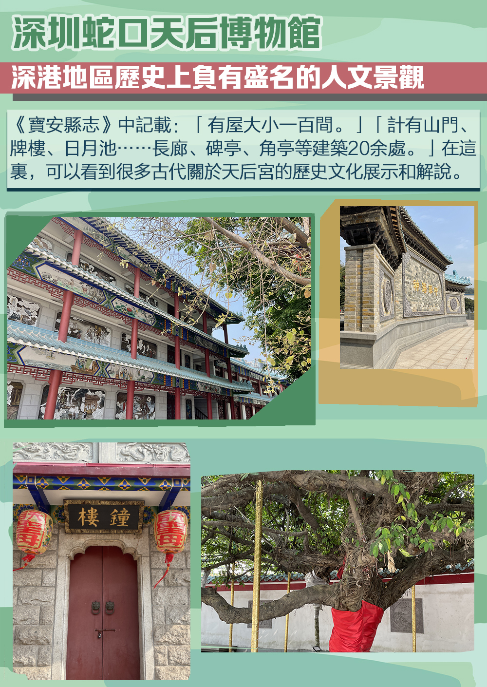 位於深圳市南山區赤灣村旁小南山下的赤灣天后宮,不僅是深港地區歷史上最負盛名的人文景觀,也是一座天后博物館。《寶安縣志》記載:「有屋大小一百間。」「計有山門、牌樓、日月池、石橋、鐘樓、鼓樓⋯⋯長廊、碑亭、角亭等建築20餘處。」在這裏,可以看到很多古代關於天后宮的歷史文化展示和解說。