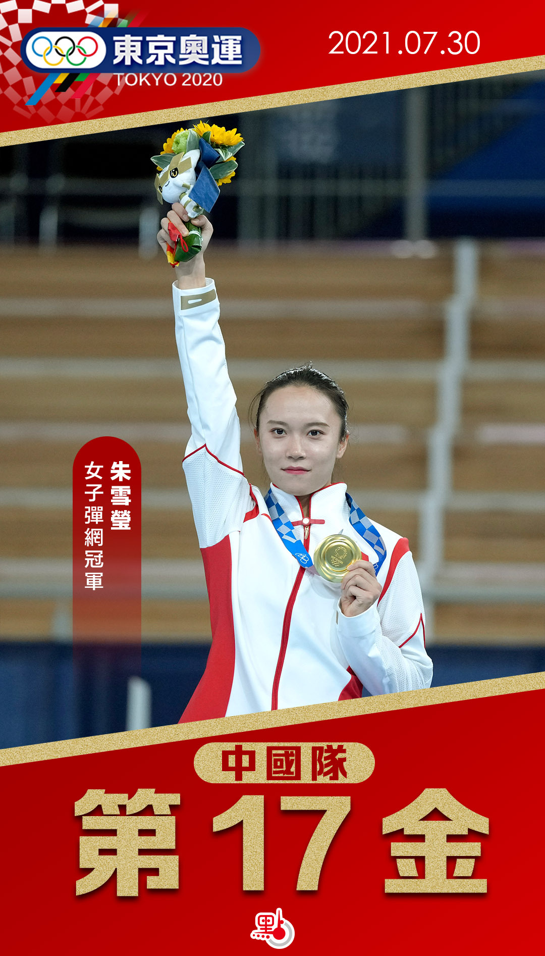 今日(30日)下午,在東京奧運會上,中國選手朱雪瑩在女子彈網(蹦床)個人賽中獲得金牌,她的隊友劉靈玲獲得銀牌,兩人分別得56.635分及56.350分。英國選手得銅牌。上兩屆金牌得主、加拿大選手麥克琳南爭取三連冠失敗,得第4名。國家隊在今屆奧運取得的金牌,增至17面。