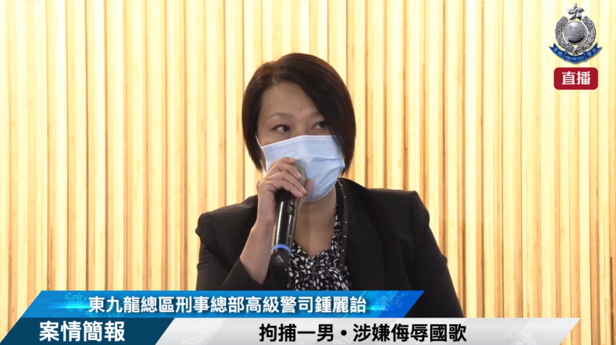 警方東九龍總區刑事總部高級警司鍾麗詒表示,警方在兩日前接獲市民舉報,指網上流傳多個片段,涉及觀塘一個大型商場在直播東京奧運頒獎儀式時,當國歌奏起,商場裏有人公開故意高舉港英旗,甚至煽動其他在場人士喝倒彩及呼叫口號,做出侮辱國歌的行為,目的是想挑起在場人士仇恨,意圖將運動政治化。