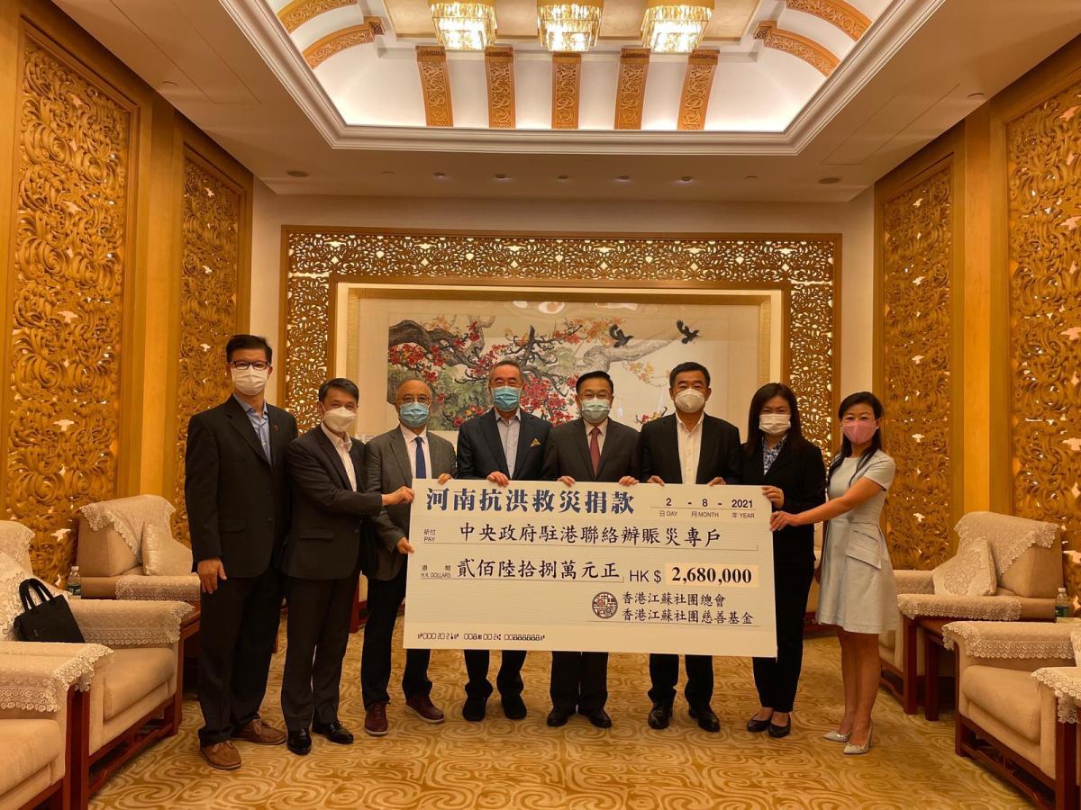 河南省近日遭遇罕見極端強降雨,鄭州等地發生嚴重澇災,造成重大人員傷亡和財產損失,香港各界紛紛向受災地區捐款。香港江蘇社團總會會長唐英年今日(2日)與總會代表前往香港中聯辦,將香港江蘇社團總會募捐的268萬元善款捐至中央政府駐港聯絡辦賑災專戶,由香港中聯辦副主任何靖代表接收。