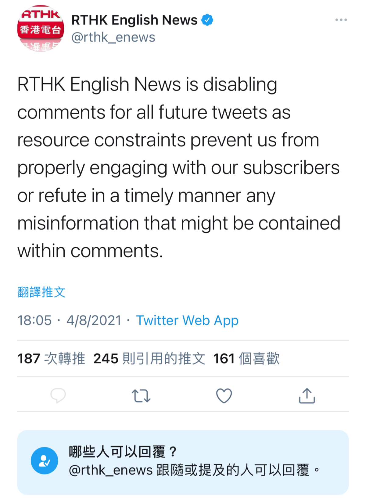 香港電台英文新聞官方Twitter專頁「RTHK English News」,今日(4日)傍晚6時許發帖,表示未來所有帖文將不會開啟留言功能。港台解釋,由於資源限制,他們無法確保與其訂閱網民有合適互動,或者及時駁斥錯誤資訊,因此決定關閉未來所有帖文的留言功能。另外,在該條貼文之前發布的所有貼文,已無法查看。