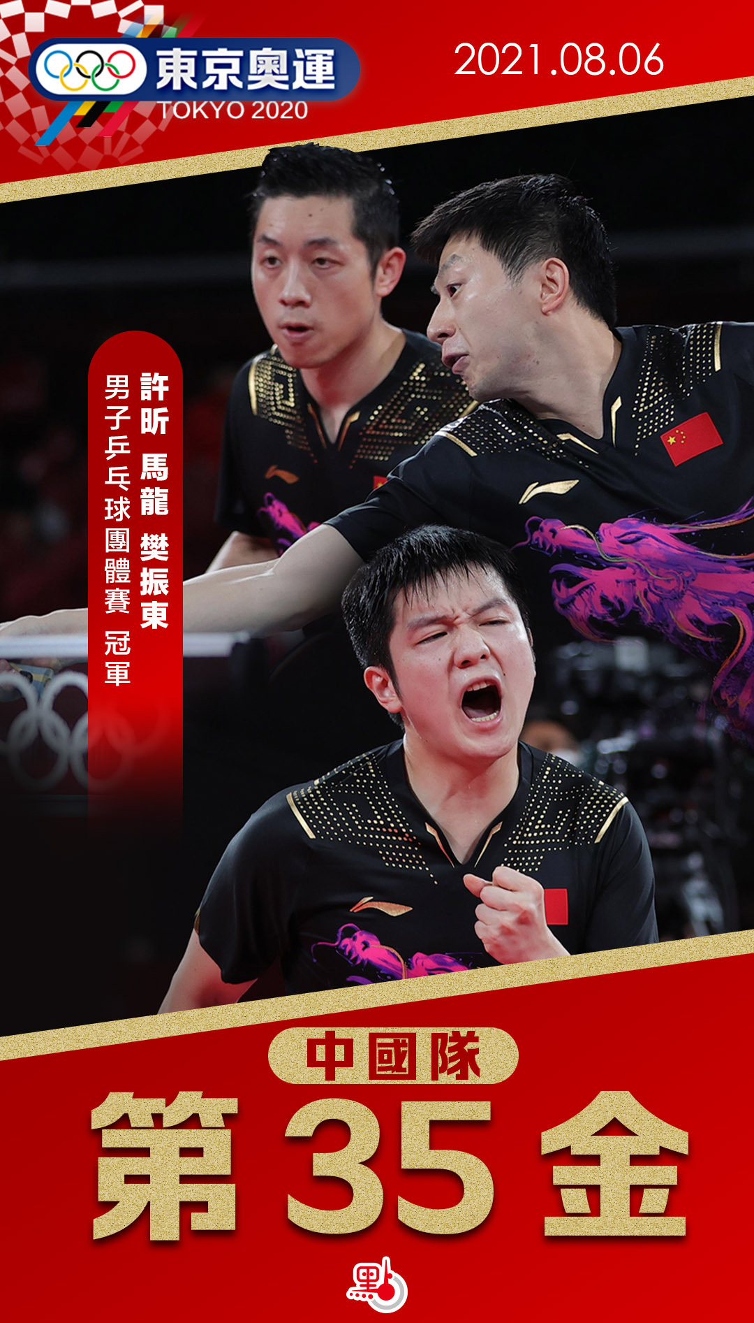 今日(6日)男子團體乒乓球決賽中,中國選手許昕、樊振東、馬龍以大比分3:0的成績戰勝德國選手,取得勝利,成功衛冕,為中國體育代表團奪得第35金。