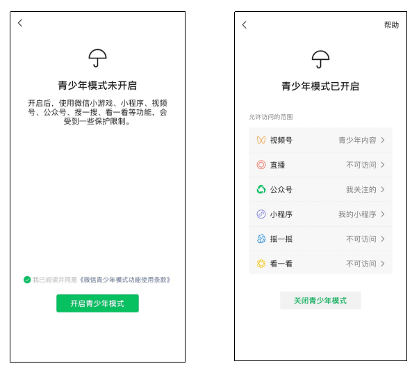 騰訊微信容許家長將賬號設置成「青少年模式」,關閉遊戲、購物等功能,將自己賬號給子女使用,亦可以由家長設定登入密碼,代子女管理微信賬號,但有內地民眾就指,子女如有個人手機,可在微信選擇忘記密碼的方法,以驗證碼通過後更改密碼,登入賬號後可關閉青少年模式。