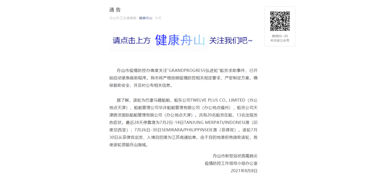 8月8日,一位自稱「郭玉強」的水手在社交平台求助的信息得到廣泛傳播。該水手稱,船上共有13位船員出現了發熱症狀,「船員病情加重,全身無力,船舶無法再繼續航行」,於是向政府和海事部門求助。交通運輸部相關負責人今日(8日)回應點新聞記者,表示已經進行處置,目前天津和浙江地方政府都在行動。舟山市新型冠狀病毒肺炎疫情防控工作領導小組辦公室同日發布通告,稱舟山市疫情防控辦高度關注船員求助事件,已開始啟動緊急救助程序。