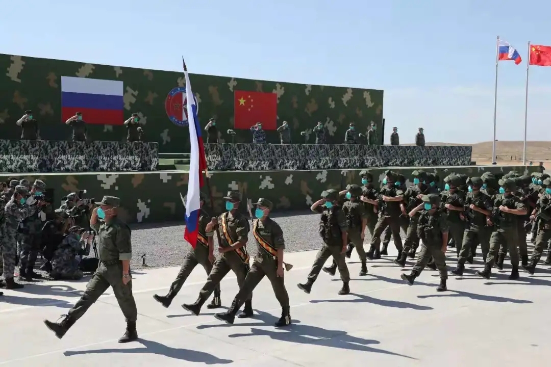 中俄兩國國旗高高飄揚,中俄兩軍地面方隊威嚴佇立。演習開始儀式上,兩軍參演官兵按作戰編成編組13個地面方隊、兩個空中梯隊,接受沙場檢閱。隨後,聯合指揮部指揮員、西部戰區副司令員劉小午,聯合指揮部副指揮員、俄軍東部軍區副司令諾蘇列夫分別致辭。